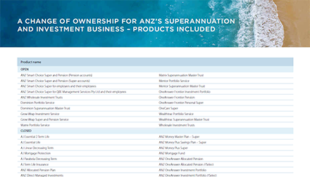 The sale of ANZ’s superannuation and investment business includes super, insurance through super, pension, investment and wrap products.