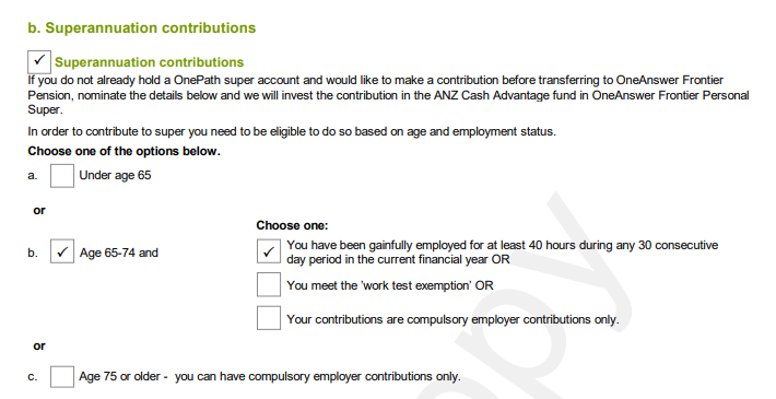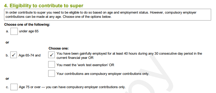 From 1 July 2020 until the form is updated please tick ‘Yes’ at the ‘gainfully employed’ question for members who are age 65 or 66 as shown below in the screenshots.![]()