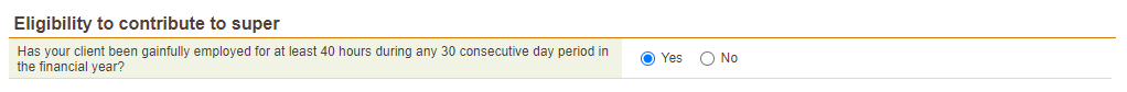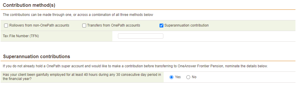 If your client is making a ‘superannuation contribution’ as part of the pension set up, please tick ‘Yes’ at the ‘gainfully employed’ question for members who are age 65 or 66 as shown below in the screenshots.